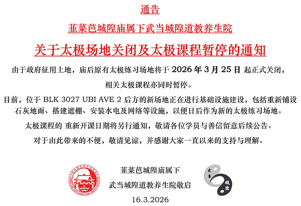 Due to government land acquisition, the existing Taiji practice venue located behind the temple will be officially closed with effect from 25 March 2026.